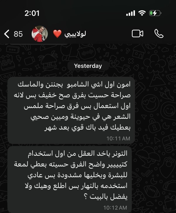امون اول اشي الشامبو بجننن والماسك صراحة حسيت بفرق صح خفيف بس لانه اول استعمال بس فرق صراحة ملمس الشعر هي في حيوينة ومبين صحيي بعطيك فيد باك قوي بعد شهر